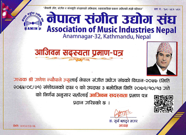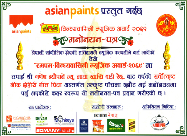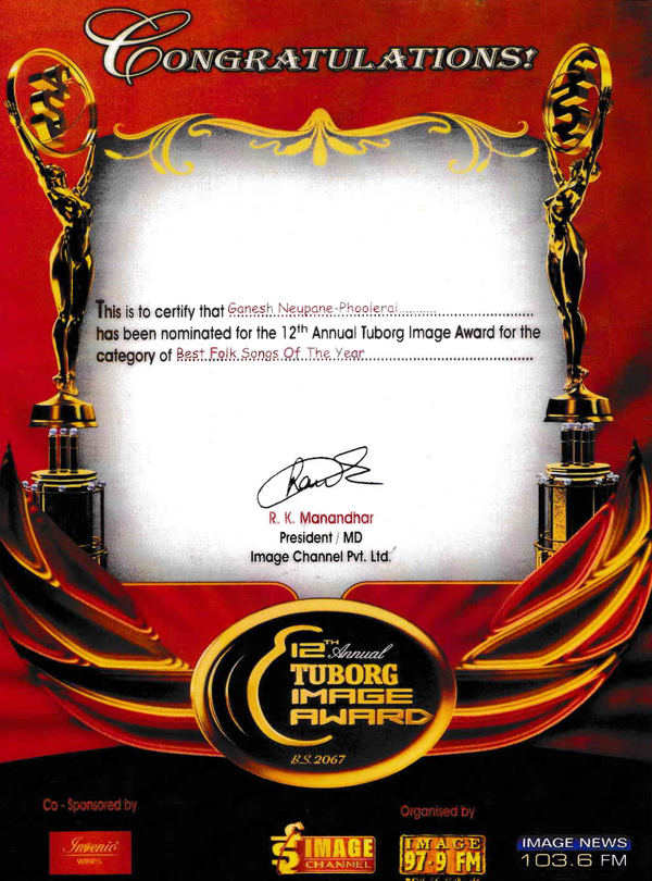National Musical Image Award Nomination Certificate 2070