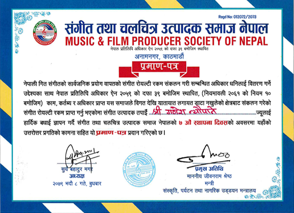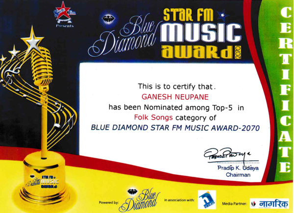 National Musical Image Award Nomination Certificate 2070