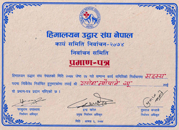 I successfully completed trekking guide course in 1983 organized by His Majesty Government Ministry of Tourism, Hotel management & Tourism training center. Then in 1987, I also successfully completed Mountain climbing guide course from Mountain school, Manang run by Nepal Mountaineering Association. I worked 6 yrs. with Yeti Trekking Pvt. Ltd., 3 yrs. with Mountain River adventure Trekking Pvt. Ltd. & 2 yrs. with Back & Track adventure Trekking Pvt. Ltd.