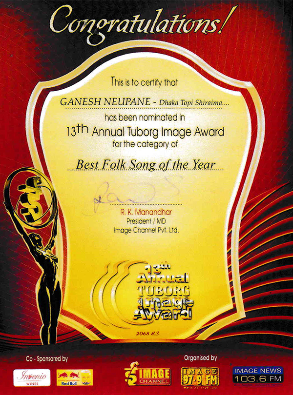 Receiving 10th National Musical Image Award Best Folk song of Year 2008 by top Nepali Singers